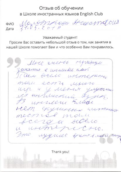 Мне очень нравятся занятия в English Club. Там весело, интересно, там есть много игр и у меня улучшился английский язык.