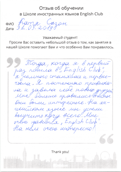Тогда, когда я в первый раз пошла в English Club, я немного стеснялась и нервничала. Я постепенно привыкала и завела себе новых друзей.