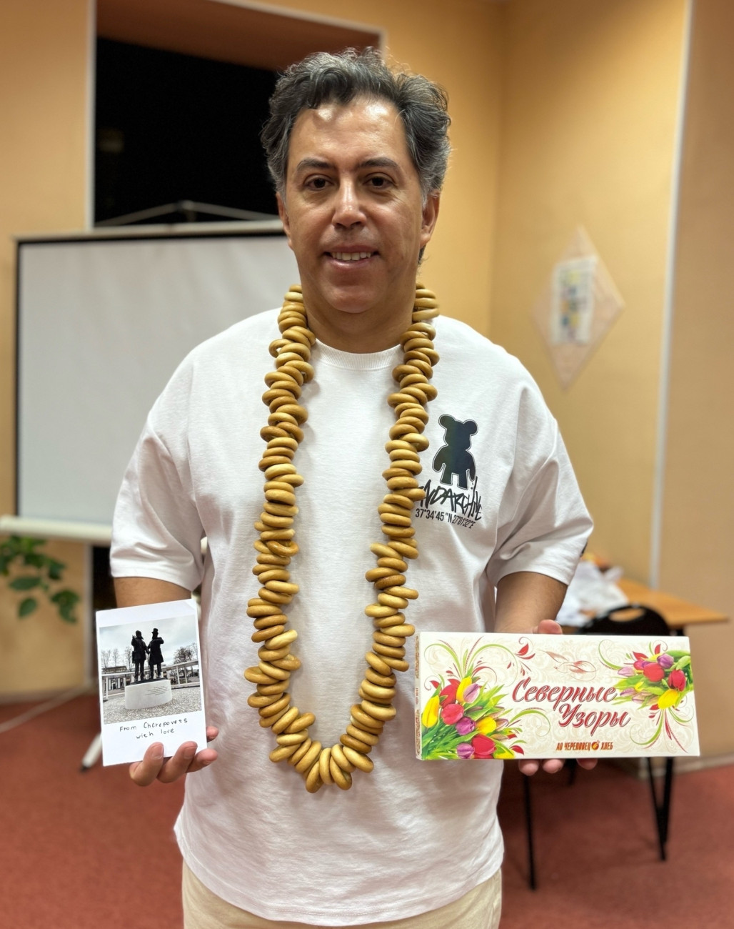 Бусы из баранок и открытки "Из Череповца с любовью" добавили еще больше теплоты в прием гостей.