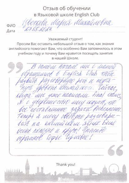 В самом начале мы с мамой обращались в English Club, чтобы развить разговорную речь и подтянуть уровень английского.