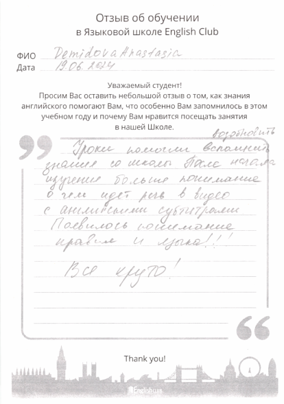Уроки помогли вспомнить знания со школы. После начала изучения больше понимания, о чем идет речь в видео с английскими субтитрами. Появилось понимание правил и языка!