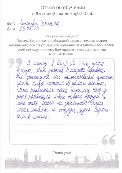 Я хожу в English Club уже 4 года. Мой учитель Валерия Сергеевна.