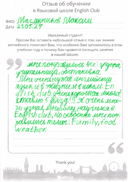 Мне понравилось все: группа, учительница, обстановка. Мне очень нужен английский язык в жизни и в школе.