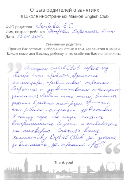 Посещаем English Club первый год. Дочери очень нравится. Приятная атмосфера, приветливый персонал.