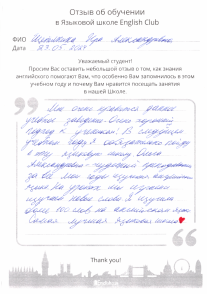 Мне очень нравится данное учебное заведение. Очень хороший подход к ученикам! В следующем учебном году я обязательно пойду в эту языковую школу.