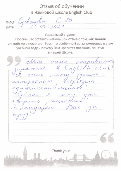 Мне очень понравились занятия в English Club! Я очень много узнала интересного, встретила единомышленников!
