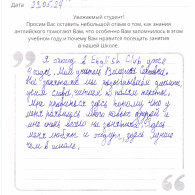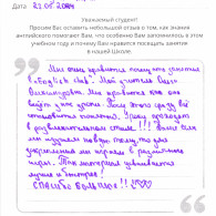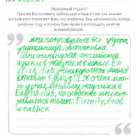 Мне очень нравится посещать занятия в English Club. Мой учитель Ольга Александровна. Мне нравится, как она ведет у нас уроки. После этого сразу все становится понятно.
